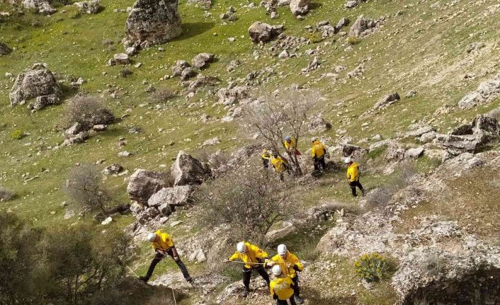 Denizli’de Dağ Arama Kurtarma (DAK) ekibinde yer alan 11 gönüllü, Pamukkale ilçesinde bulunan kayalık bölgede doğal afetlere karşı 7 saat iple eğitim aldı.