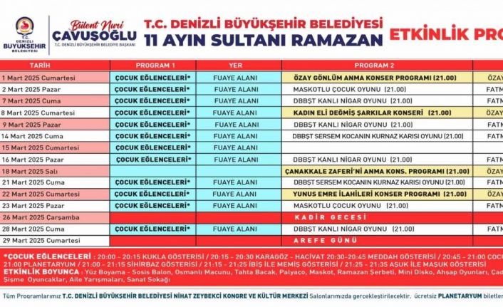 Her gün 7’den 70’e herkese hitap eden farklı etkinliklerin ücretsiz olarak yer aldığı Büyükşehir Belediyesinin ramazan ayı programlarına tüm Denizlililerin davetli olduğu belirtilirken, etkinliklerin detayına www.denizli.bel.tr adresinden ulaşılabiliyor.