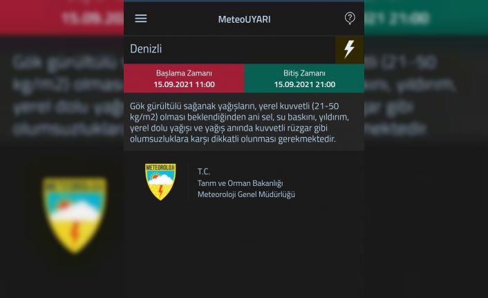 Meteoroloji Genel Müdürlüğü tarafından yapılan açıklamada “Denizli’de yarın 11.00 ila 21. 00 saatleri arasında etkili olacağı tahmin edilen gök gürültülü sağanak yağışların, metrekareye 21- 50 kilogram yağış olması beklendiğinden ani sel, su baskını, yıldırım, yerel dolu yağışı ve yağış anında kuvvetli rüzgar gibi olumsuzluklara karşı dikkatli olunması gerekmektedir” ifadelerini yer aldı.