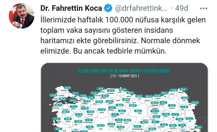 Sağlık Bakanı Dr. Fahrettin Koca, sosyal medya hesabı üzerinden Denizli’de 13 ile 19 Mart 2021 arasındaki vaka sayısının 100 bin kişiden 49.38’inin olduğunu açıkladı.