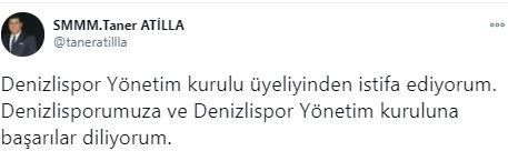 Yukatel Denizlispor yönetiminin istifa etmesini beklediği Taner Atilla, sosyal medya hesabı üzerinden Yönetim Kurulu üyeliğini bıraktığını duyurdu.