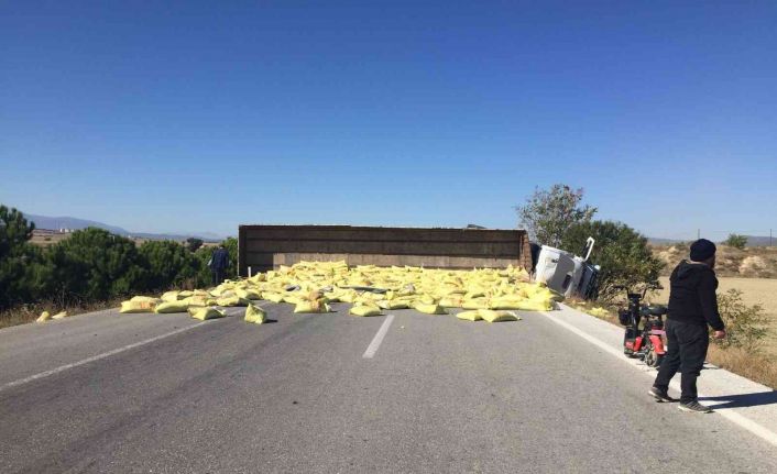 Denizli’nin Çardak ilçesinde gübre yüklü tır, kontrolden çıkması sonucu devrilerek yolu tamamen kapattı. Sürücünün yaralandığı kazada ekipler uzun uğraşlar sonucu çuvalları toplayarak yolu trafiğe açtı.
