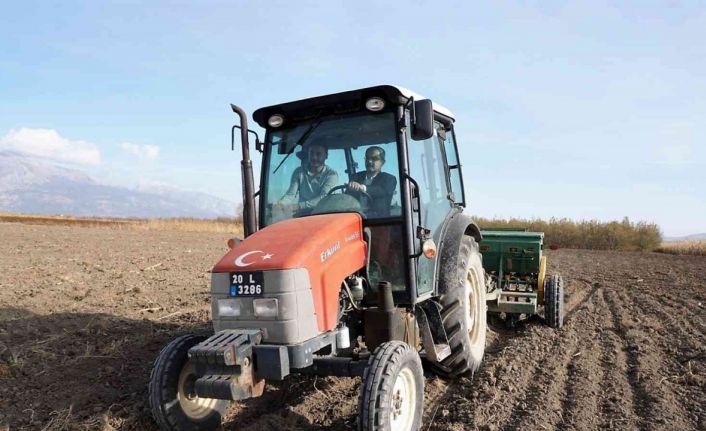 Denizli’nin Çivril Belediye Başkanı Niyazi Vural, traktörün direksiyonuna geçerek, yerli tokum ’Goca buğdayı’ belediyeye ait tarlalarda toprakla buluşturdu.