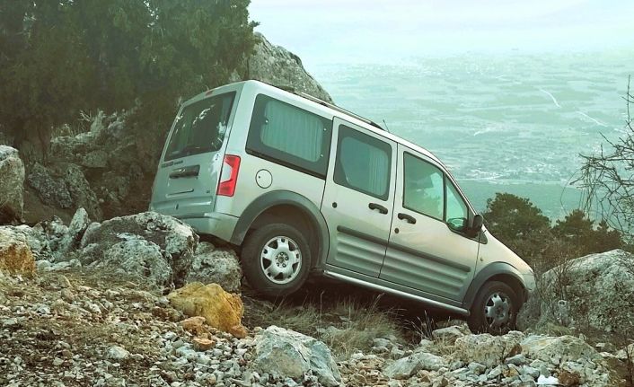 Denizli’nin Tavas ilçesinde park halindeyken freni boşalan hafif ticari araç, uçuruma sürüklenerek kayalıklarda asılı kaldı.