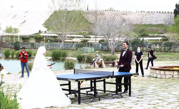 Öte yandan, arka planda Pamukkale’nin güzelliği olduğu etkinlikte sporcular, turistler ve katılımcılar pandemi tedbirleri çerçevesinde masa tenisi oynadı. Bir gelin damat ise hatıra fotoğrafının ardından birlikte masa tenisi oynadılar.