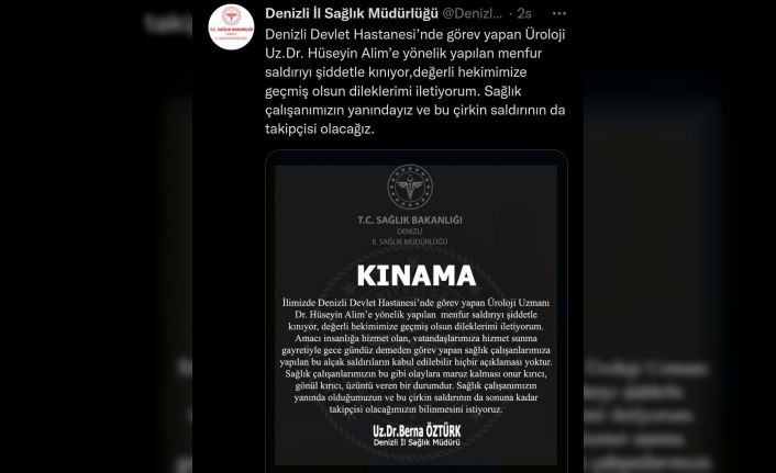 Denizli Devlet Hastanesinde görevli Üroloji Uzmanı Dr. Hüseyin Alim, çalıştığı sırada bir hasta tarafından yumrukla darp edildi. Vatandaşların ve görevlilerin araya girerek ayırdığı olay sonrası şüpheli gözaltına alındı. Konu hakkında sosyal medyadan açıklamam yayımlayan Denizli İl Sağlık Müdürü Berna Öztürk, saldırıyı kınayarak, “İlimizde Denizli Devlet Hastanesi’nde görev yapan Üroloji Uzmanı Dr. Hüseyin Alim’e yönelik yapılan menfur saldırıyı şiddetle kınıyor, değerli hekimimize geçmiş olsun dileklerimi iletiyorum. Amacı insanlığa hizmet olan, vatandaşlarımıza hizmet sunma gayretiyle gece gündüz demeden görev yapan sağlık çalışanlarımıza yapılan bu alçak saldırıların kabul edilebilir hiçbir açıklaması yoktur. Sağlık çalışanlarımızın bu gibi olaylara maruz kalması onur kırıcı, gönül kırıcı, üzüntü veren bir durumdur. Sağlık çalışanımızın yanında olduğumuzun ve bu çirkin saldırının da sonuna kadar takipçisi olacağımızın bilinmesini istiyoruz” dedi.