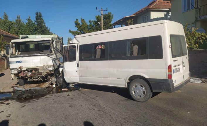 Denizli’de işçileri indirdikten sonra sürücüsünün kontrolünden çıkan minibüs, çöp kamyonuyla kafa kafaya çarpıştı. Meydana gelen kazada bir kişi yaralanırken, minibüsün boş olması olası facianın önüne geçti.