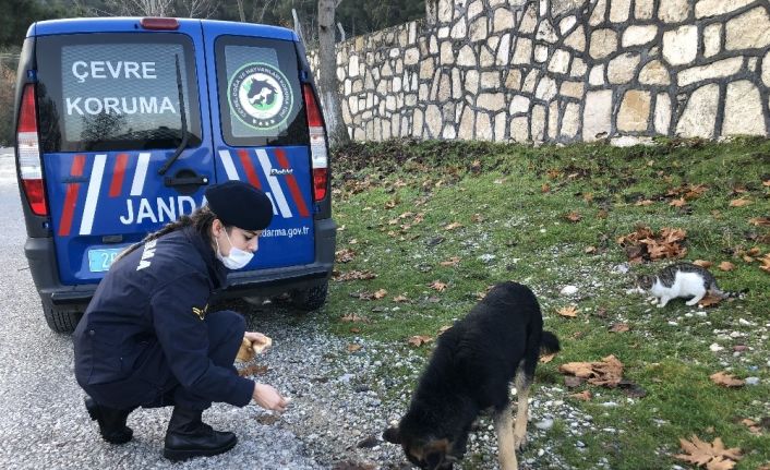 Denizli’de hafta sonu sokağa çıkma kısıtlamalarında hayvan severlerin ilgilenemediği sokak hayvanlarını jandarma ekipleri elleri ile besledi.
