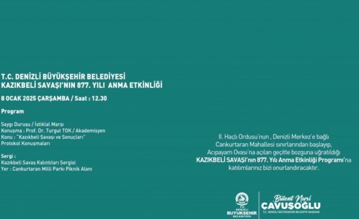 Denizli Büyükşehir Belediyesi, 7-8 Ocak 1148’de Denizli’de gerçekleşen ve Anadolu’nun Türk yurdu olmasında büyük önem taşıyan Kazıkbeli Savaşı’nın yıldönümünde anma etkinliği düzenleyecek.