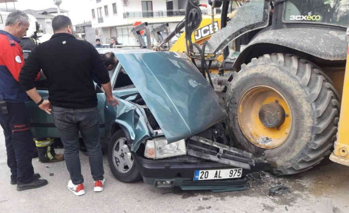 Denizli’de kepçe ile çarpışan otomobilin hurdaya döndüğü kazada 2 kişi, sıkıştığı yerden uzun uğraşlar sonucu yaralı olarak kurtarıldı.