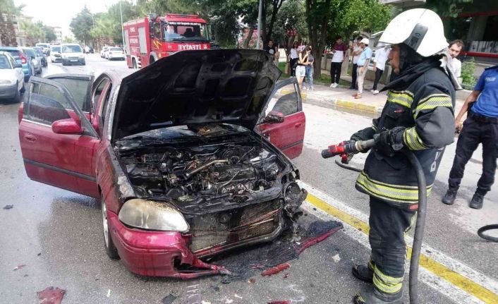 Denizli’de kırmızı ışıkta bekleme yaptığı esnada motor kısmından dumanlar yükselen otomobil alev alev yandı.