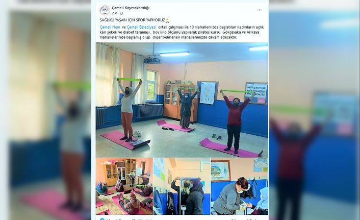 Çameli Kaymakamlığı Halk Eğitim Merkezi ve Çameli Belediyesi’nin ortaklaşa hazırladığı proje kapsamında kırsal 10 mahallede başlatılan kadınların açlık kan şekeri ve diyabet taraması ile boy kilo ölçümü yapılarak pilates kursu verilen etkinlik Gökçeyaka ve Arıkaya mahalleleriyle devam etti. Yapılan etkinlikle ilgili olarak Çameli Kaymakamlığı’nın resmi sosyal medya sayfasından “Çamelili kadınlar spor yapıyor” başlığıyla yapılan paylaşımda, proje hakkında bilgi verilerek, çalışmaların da devam edeceği duyuruldu.