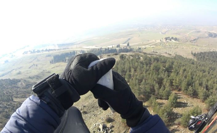 Türkiye’nin farklı birçok noktasından uçuş yapan Denizlili paraşütçüler, bu kez beyaz cennet Pamukkale’nin üzerinden doğadaki kuşlar için atlayış yaptı. Karda kışta yiyecek bulamayan yaban hayatına doğada çözülebilir paketler hazırlayan pilotlar, kuşlar aç kalmasın diye dağı buğday bombardımanına tuttu.