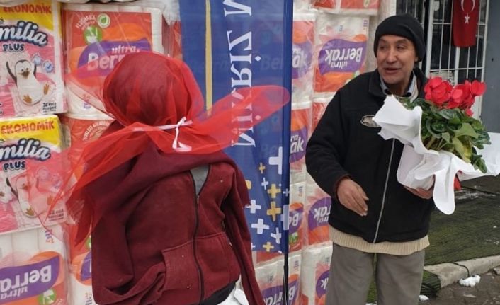 Tavas’ta market işleten Yusuf Kısaoğlu, etkili olan kar yağışını da fırsat bilerek ilçenin renkli simalarından olan ve bugüne kadar hiç evlenmemiş 53 yaşındaki Ali Matrak’a benzerine az rastlanır bir şaka yaptı. Dükkanının önüne yaptığı kardan geline kıyafet giydiren Kısaoğlu, Ayşe ismini verdiği kardan gelin için Ali Matrak’a hız isteme merasimi düzenledi. Eline canlı bir çiçek tutuşturulan Ati Matrak, ‘Ali ve Ayşe’ isimlerinin yazıldığı kardan gelini, kendisine istedi. Kız isteme cümlelerini tekrarlayan Matrak’ın doğal tavırları görenleri gülümsetti.