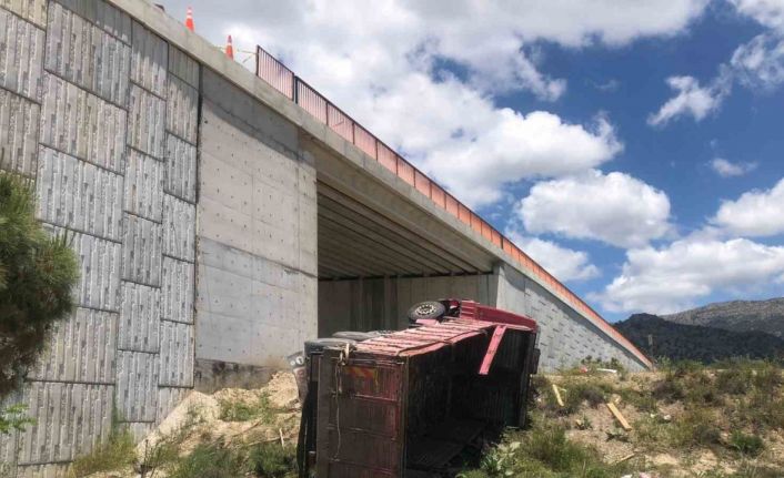 Denizli’nin Çardak ilçesinde önünde kaza yapan otomobile çarpmamak için sürücüsünün manevra yaptığı kamyon, 8 metrelik köprüden aşağı düştü.
