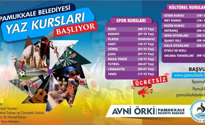 Her yaştan vatandaş için çeşitli kurslar açan Pamukkale Belediyesi, okulların kapanmasıyla birlikte yaz kurslarını da açacak. Pamukkale Belediyesi, bu yaz kurslarını spor ve kültürel olmak üzere iki başlıkta hazırladı. Yaz tatili döneminin başlamasıyla, gençlerin yaz tatillerini daha verimli geçirmesi amacıyla Pamukkale Belediyesi’nin her yaz düzenlediği yaz kursları bu yıl, 18 farklı alanda 4-17 yaş arası gençlere hitap edecek.