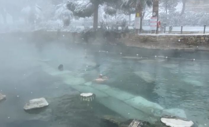 Dünya Kültür Mirası Listesi’nde yer alan ve kar kalınlığının 30 santimetreye kadar ulaştığı beyaz cennet Pamukkale’ye gelen yabancı turistler, yoğun kar yağışı altında termal havuzda yüzmenin keyfini çıkardı.
