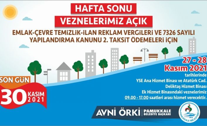 Pamukkale Belediyesi Emlak, Çevre Temizlik, İlan Reklam vergileri ile bu vergilere ait yapılandırma taksitlerinin son ödeme tarihinin 30 Kasım 2021 Salı gününe denk gelmesi nedeniyle vatandaşların mağduriyet yaşamamaları için hafta sonu veznelerini açık tutacak. Vatandaşlar Cumartesi ve Pazar günleri 09.00 ile 17.00 saatleri arasında ödemelerini yapabilecek.