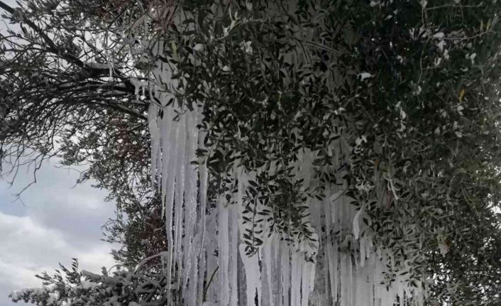 Denizli’de borusu patlayan çeşmeden akan su zeytin ağacında buz sarkıtları oluşturarak ilginç görüntü ortaya çıktı.