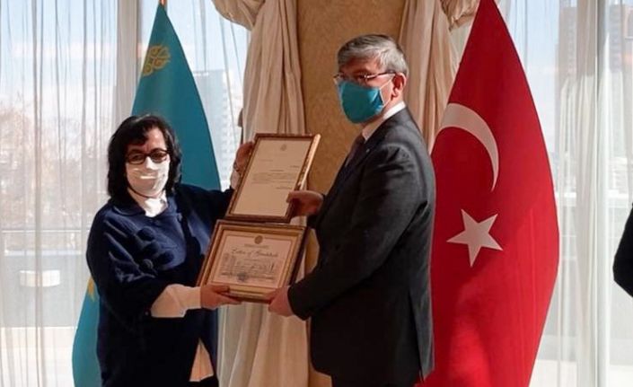 PAÜ Fen Edebiyat Fakültesi Çağdaş Türk Lehçeleri ve Edebiyatları Bölüm Başkanı Prof. Dr. Nergis Biray, gerçekleştirdiği çalışmalarda Türk-Kazak dostluğuna sunduğu katkılarından dolayı Kazakistan Devleti Ödülüne layık görüldü. Ankara Kazakistan Büyükelçiliğinde düzenlenen ödül töreninde Prof. Dr. Nergis Biray; Cumhurbaşkanı Kassym Jomart Tokayev’in imzasıyla teşekkürname ile Kazakistan Kültür ve Spor Bakanı A. Raimkulova’nın teşekkürnamesi’ni Kazakistan Ankara Büyükelçisi Abzal Saparbekuly’nin elinden aldı. Prof. Dr. Biray’a Uluslararası Türk Akademisi Abay-175 plaketini ise Uluslararası Türk Akademisi Başkanı Darhan Kıdırali takdim etti. Nursultan Nazarbayev imzalı Abay’ın 175. Yılı ve Türk Kazak Dostluğuna Hizmet Madalyaları, salgın sürecinin seyrine göre ileri bir tarihte yapılacak tören ile takdim edilecek. Ödül ve plaket takdiminin ardından tören hatıra fotoğrafı çekimi ile son buldu.PAÜ’lü akademisyen Kazakistan devlet ödülünün sahibi oldu