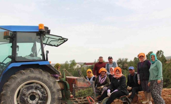 Poşusunu takan Kaymakam Kuran üreticilerle birlikte kekik dikti