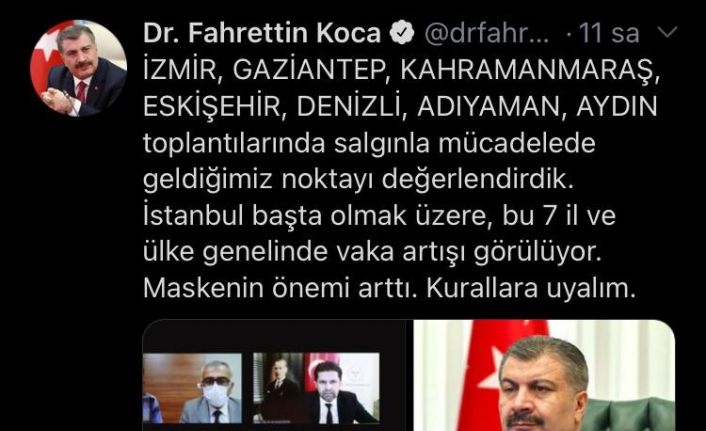 Akşam saatlerinde sosyal medya hesabı üzerinden paylaşımda bulunan Sağlık Bakanı Fahrettin Koca, Denizli, İstanbul, İzmir, Gaziantep, Kahramanmaraş, Eskişehir, Adıyaman ve Aydın’da vaka artışlarının görüldüğünü belirtti. Bakan Koca yaptığı paylaşımda bu 7 ilin Sağlık Müdürleri ile salgınla mücadele kapsamında gelinen noktayı değerlendirdiklerini söyledi. Bakan Koca’nın paylaşımında "İzmir, Gaziantep, Kahramanmaraş, Eskişehir, Denizli, Adıyaman, Aydın toplantılarında salgınla geldiğimiz noktayı değerlendirdik. İstanbul başta olmak üzere, bu 7 il ve ülke genelinde vaka artışı görülüyor. Maskenin önemi arttı. Kurallara uyalım." ifadelerini kullandı. Son iki haftadır Bakan Koca, Denizli’ye yönelik vaka artışlarını dile getirmesi dikkatlerden kaçmadı.