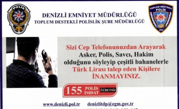 Denizli İl Emniyet Müdürlüğü tarafından konuya ilişkin yapılan yazılı açıklamada “Kendilerini polis, asker veya savcı olarak tanıtarak yapılan dolandırıcılık olaylarının, önüne geçilebilmesi, şüpheli şahısların yakalanmaları ve vatandaşlarımızın mağdur olmalarının engellenmesi amacıyla vatandaşlarımızın bu tür dolandırıcılık olaylarıyla karşılaşmaları halinde bu şahıslara itibar etmemeleri, şüphe arz eden bir durumda 155-112 ihbar hattını aramaları gerekmektedir. Unutmayın! Polis asker veya savcı sizden para, hesap numarası, ziynet eşyası istemez” ifadeleri yer aldı.