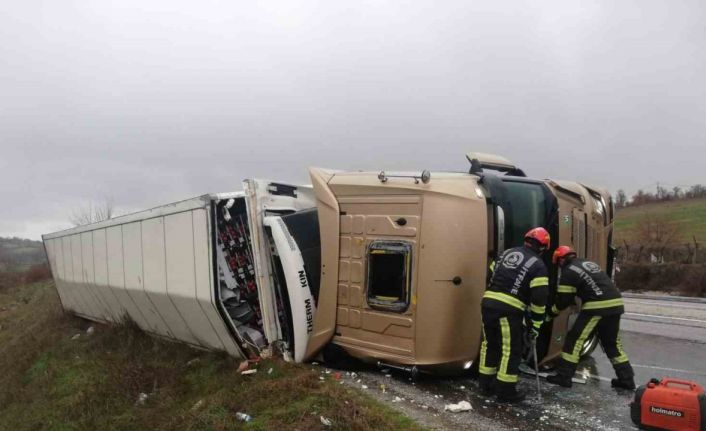 Yağış nedeniyle kontrolden çıkan tır devrildi; 1 yaralı