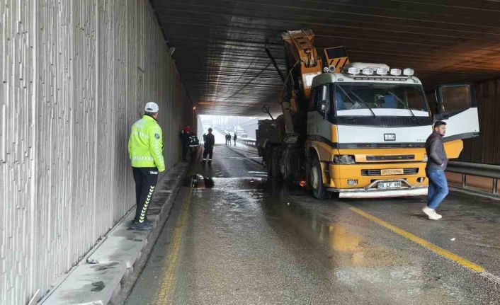Denizli’de inşaat yapı malzemeleri taşıyan vinç alt geçitte sıkıştı. Alt geçit trafiğe kapatılırken, ekiplerin sıkışan vinci kurtarma çalışmaları sürdürüyor.