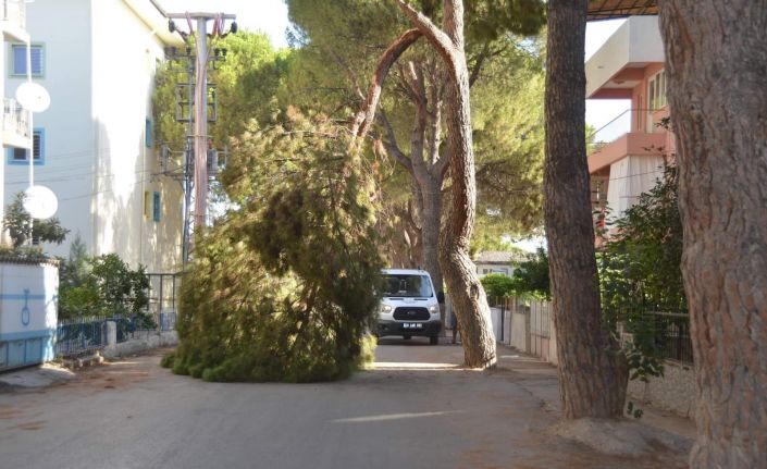 Denizli’nin Sarayköy ilçesinde kaldırımda bulunan çam ağacı sabah saatlerinde kırılarak yola devrildi.