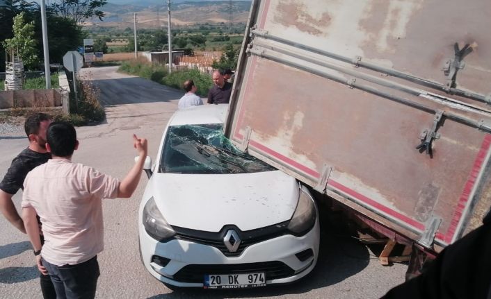 Çarpmanın etkisiyle kontrolden çıkan dağıtım aracı, bir süre zikzaklar çizdikten sonra yön tabelalarını da devirerek tali yoldan ana yola çıkmak üzere olan Murat Ç.’nin kontrolündeki 20 DK 974 plakalı otomobilin üzerine devrildi. Sürücülerin burunları bile kanamadan atlattığı kazada, her 3 araçta da maddi hasar oluştu. Üzerine devrildiği otomobile zarar veren dağıtım aracı, vinç yardımıyla aracın üzerinden alındı.