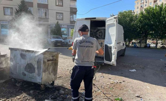 Diyarbakır’ın AK Partili Bağlar Belediyesi, sıcak hava koşulları nedeniyle kötü koku ve hastalık riskine karşı ilçe merkezi ve kırsal yerleşim yerlerindeki çöp konteynerlerini deterjanlı suyla dezenfekte ederek bakımdan geçiriyor.