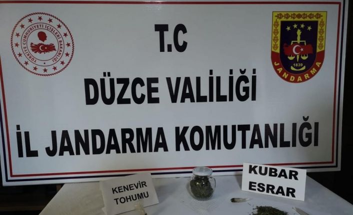 DÜZCE(İHA) – Düzce Merkez İlçe Jandarma Komutanlığı ile KOM ekiplerinin gün ağarırken yaptıkları ortak operasyonda 2 gram kenevir tohumu ve 28 gram kubar esrar maddesi ele geçirildi.
