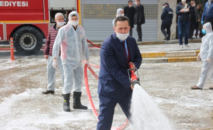 Çalışmaları yerinde inceleyen Başkan Yanmaz, Bahadır yalçın caddesinde ve Çuhalı Caddesinde itfaiye hortumunun başına geçerek köpüklü su ile arındırma çalışmalarında personeline yardım etti.
