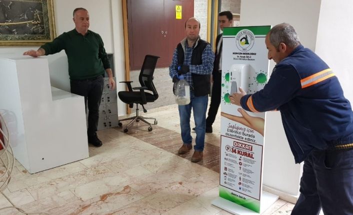 Düzce Belediyesi, Çin’in Wuhan kentinde ortaya çıkan ve kısa sürede tüm dünyaya yayılan yeni tip koronavirüs salgınına karşı aldığı tedbirleri uygulamaya devam ediyor. Düzce Belediyesi Destek İşleri Müdürlüğü’ne bağlı ekipler, merkez hizmet binasına ve ek hizmet binalarına, hizmet binalarındaki katlara personelin ve vatandaşların kullanması için el dezenfektan kutuları yerleştirildi.