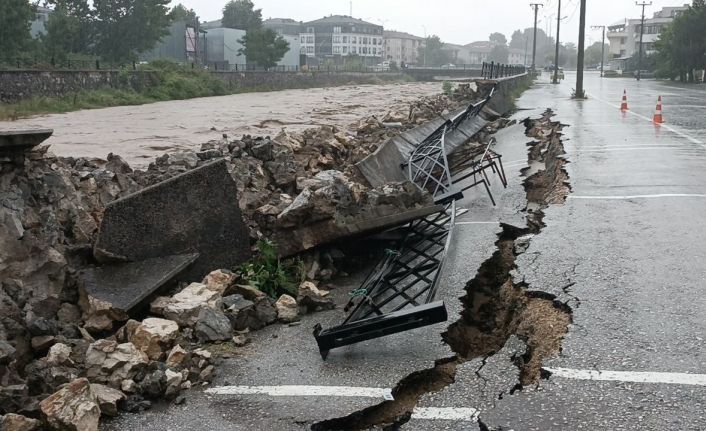 DÜZCE(İHA) – Düzce’de sağanak yağış etkili oldu. Yağış ile birlikte Asar deresinin su debisi yükseldi şiddeti artan dere yolu kısmen yuttu ekipler yolu trafiğe kapattı.