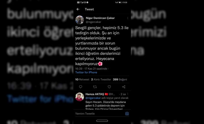 Düzce’de meydana gelen 5 büyüklüğündeki deprem sonrasında Düzce Üniversitesi Rektörü Prof. Dr. Nigar Demircan Çakar, üniversite yerleşkesi ile yurtlarda herhangi bir sorunun olmadığını ve deprem sebebiyle ikinci öğretim derslerinin ertelendiğini sosyal medya hesabından duyurdu. Çakar, sosyal medya hesabından yaptığı paylaşımda, “Sevgili gençler, hepimiz 5.3 ile tedirgin olduk. Şu an için yerleşkemizde ve yurtlarımızda bir sorun bulunmuyor ancak bugün ikinci öğretim derslerimizi erteliyoruz. Heyecana kapılmıyoruz” ifadelerine yer verdi.