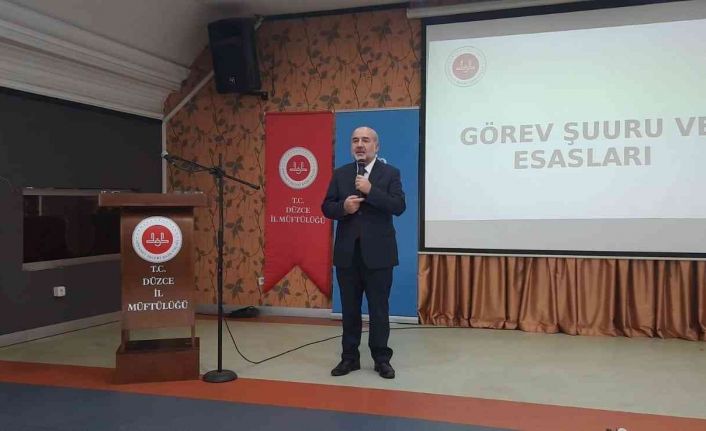 DÜZCE (İHA) – Düzce Müftülüğünce düzenlenen din görevlileri buluşmasında konuşan Diyanet İşleri Başkanlığı Başmüfettişi Dr. Dursun Aygün, kurum aidiyetinin öneminden bahsetti.