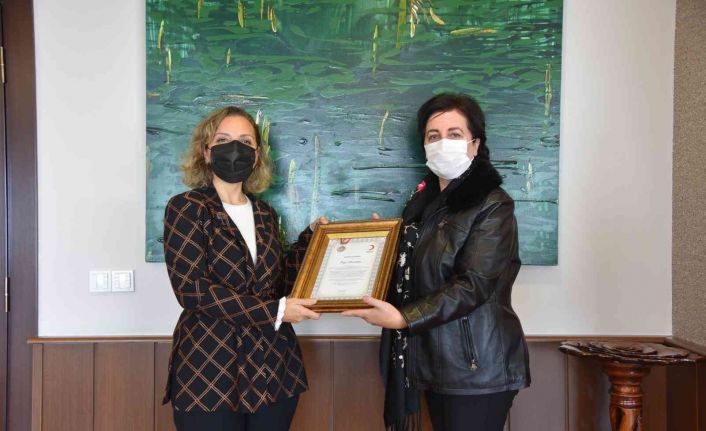 Türk Kızılay Düzce Şubesi Yönetim Kurulu’ndan Mustafa Bilgin, Şube Yetkilisi Nuray Tekin ve Kan Bağışı Kazanım Uzmanı Deniz Yomra, Düzce Üniversitesi Rektörü Prof. Dr. Nigar Demircan Çakar’ı ziyaret ederek, Düzce Üniversitesi’nin kan bağışındaki değerli katkıları için gümüş madalya, madalya beratı ve gümüş levha takdiminde bulundu.