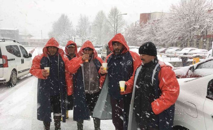 Düzce’de etkili olan kar yağışıyla birlikte Düzce Belediyesi, oluşturulan kriz merkezi üzerinden sahadaki yerlerini alarak ana arterler başta olmak üzere cadde ve sokak aralarında karla kapanan yollar ve kaldırımların temizlemesine yönelik çalışmalarını aralıksız sürdürüyor. Sabahın erken saatlerinden itibaren sahada bulunan ve yağışa rağmen, karla mücadeleyi aksatmadan sürdüren personellerin yardımına Sosyal Yardım İşleri Müdürlüğü koştu. Müdürlük, hazırladığı sıcak çorbaları, kent merkezi başta olmak üzere kentin belirli noktalarında küreme çalışmalarına devam eden ekiplere dağıtarak, dayanışma örneği sergiledi.