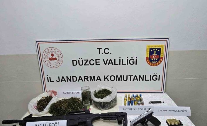 Düzce Cumhuriyet Başsavcılığı koordinesinde jandarma ekiplerince yapılan çalışmalarda Gölyaka ilçesinde M.Ş isimli şahsın evinde ve bahçesinde uyuşturucu madde bulundurduğuna yönelik duyum alındı. Alınan istihbarı bilgiler kapsamda; Cumhuriyet Başsavcılığından alınan arama kararı sonrası şahsın evi, eklentilerinde yapılan arama sonucunda 500 gram kubar esrar, 1 adet tabanca, 2 adet şarjör, 38 adet 9 mm çapında tabanca fişeği, 1 adet 7.65 mm çapında tabanca şarjörü, 1 adet yivsiz av tüfeği, 3 adet yivsiz av tüfeği şarjörü, 38 adet av tüfeği kartuşu ele geçirildi. Şahıs gözaltına alınırken, hakkında adli işlem başlatıldığı öğrenildi.