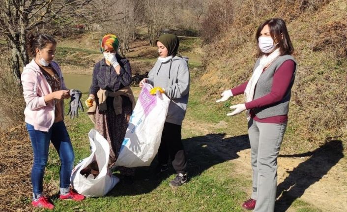 DÜZCE(İHA) – Düzce’nin Gölyaka ilçesinde bulunan Kuyudüzü Göleti ve meralarında oluşan çöp yığınlarını kadınlar topladı. Yapılan çalışma ile yaklaşık 300 kilo çöp toplayan kadınlar, ‘doğayı koruyalım’ çağrısında bulundu.