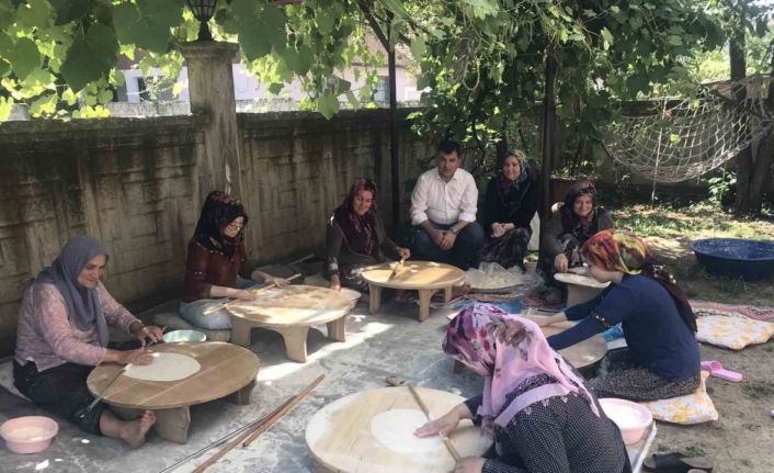 Düzce’de kadınlar yaz aylarını dolu dolu geçiriyor. Bir araya gelen kadınlar kış için hazırlıklara başladılar. Bahçe içerisinde oluşturulan alanda bir yandan yufkalar açılırken bir yandan da ocak üzerinde kurutuluyor.