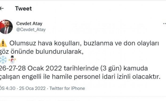 Vali Cevdet Atay, sosyal medya üzerinden yaptığı açıklamada olumsuz hava koşulları, buzlanma ve don olayları göz önünde bulundurularak 26-27-28 Ocak 2022 tarihlerinde 3 gün kamuda çalışan engelli ile hamile personel idari izinli olacağını bildirdi.