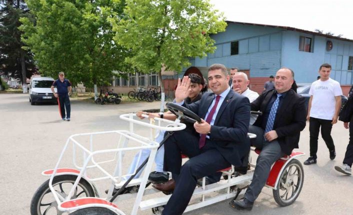 DÜZCE (İHA) – Düzce Borsa İstanbul Mesleki ve Teknik Anadolu Lisesi’nde açılan bilim fuarına katılan Vali Selçuk Aslan, öğrencilerin yaptığı bisiklete binerek dikkat çekti.