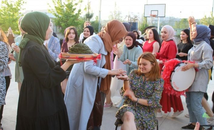 DÜZCE (İHA) – Düzce Üniversitesi’ndeki eğitimlerini tamamlayarak mezun olan öğrencilere, Necla Pekolcay Kız Öğrenci Yurdunda mezuniyet kınası yapıldı.