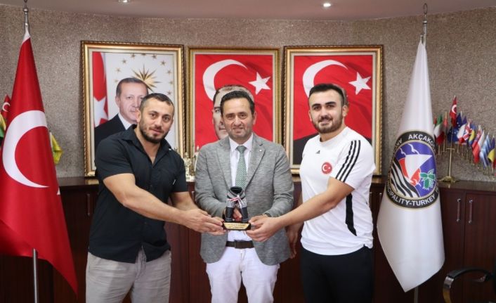 Akçakocalı Milli güreşçiler Zülfikar Çakır ve Cüneyt Çatak, Akçakoca Belediye Başkanı Okan Yanmaz’ı makamında ziyaret etti.
