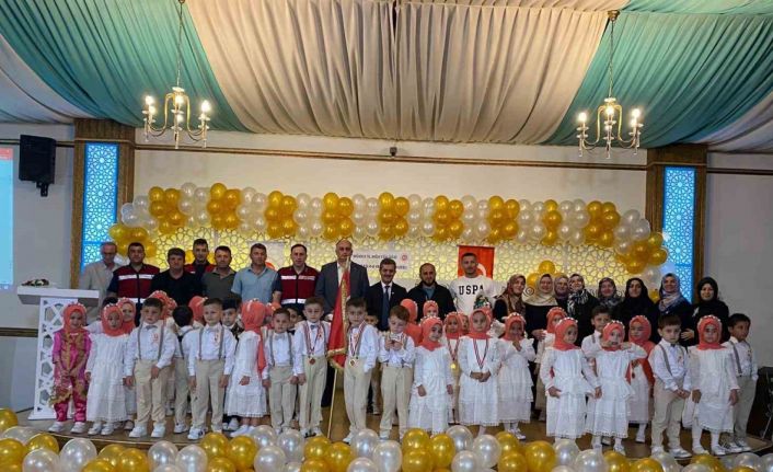 Düzce’de minik öğrencilerin katılım sağladığı Kur’an Kurslarının yıl sonu kapanış etkinlikleri devam ediyor. Bu çerçevede Beyköy Değirmenbaşı’nda bulunan 4-6 yaş Kur’an kursunun kapanış programı ailelerin ve protokol üyelerinin katılımı ile gerçekleştirildi. Kur’an-ı Kerim tilaveti ile başlayan kapanış programında kursta öğrenim gören minik öğrencilerin sahne gösterileri dikkat çekti. Programa katılan Beyköy Belediye Başkanı Fatih Ocak, Beyköy Jandarma Komutanı Emrah Aktaş, İl Müftü Yardımcısı Selma Velioğlu Çelik, İl Müftüsü Osman Aydın, miniklerin başarılarını tebrik ederek çeşitli hediyeler verdi.