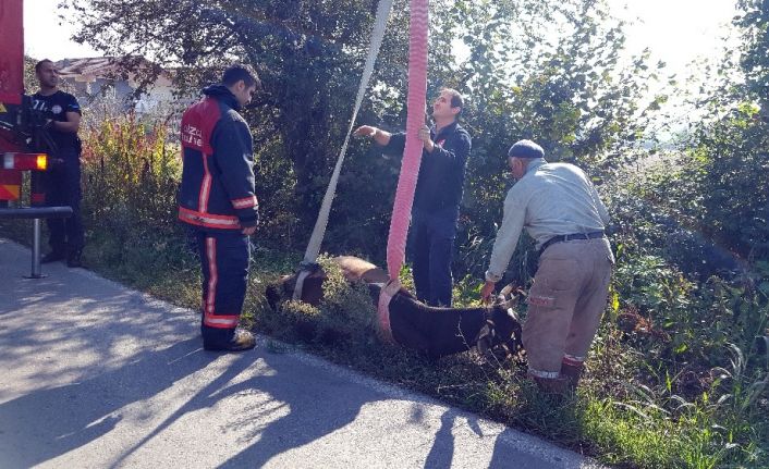 Otlamak için meraya giden büyükbaş hayvan, meranın yanında bulunan sulama kanalından atlayamayınca sulama kanalına düştü. Büyükbaş hayvanı düştüğü kanaldan Düzce Belediyesi İtfaiye Müdürlüğü’ne bağlı itfaiye aracı vinci ile kurtarıldı.