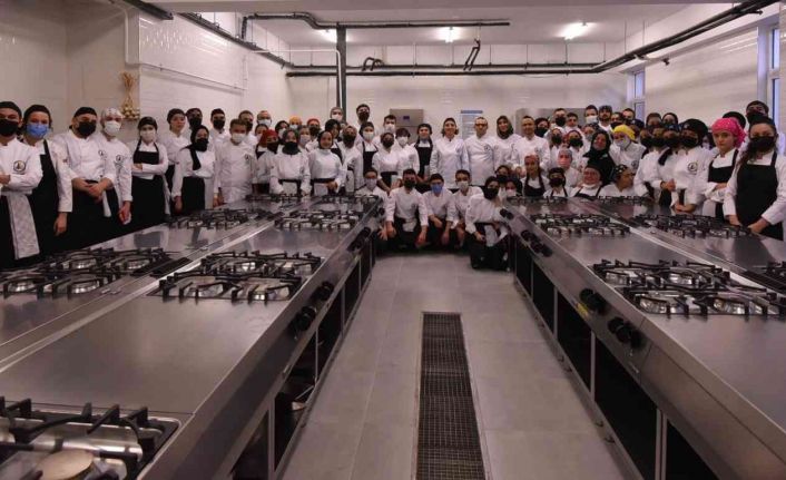 Rektör Çakar; Gastronomi ve Mutfak Sanatları bölümü 1. sınıf öğrencileriyle pastane bölümünde “Hingel” (Hinkali) ve “Fettucini Alfredo” yemeklerini, 2. sınıf öğrencileriyle ana mutfak bölümünde “Sütlü Balkabağı Çorbası” “Firik Pilavı” ve “Çerkez Tavuğu” yemeklerinin uygulamalarını birlikte gerçekleştirdi.